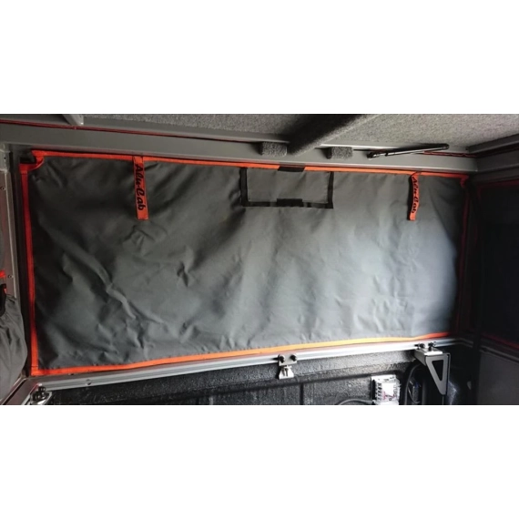 Myggnett til sidedører på Alu-Cab Canopy Camper. Festet på innsiden av sidedørene med borrelås. Laget i samme materiale som Alu-Cab telt som kan rulles opp for å bruke kun myggnettet. Alternativt kan myggnettet åpnes med glidelås og rulles opp for å ha et helt åpent vindu.