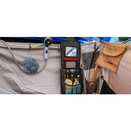 With personal preference in mind, there is three potential shower head mounting locations including the roof, backwall via velcro, and the backwall via hooks.
