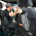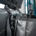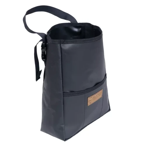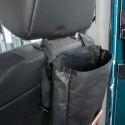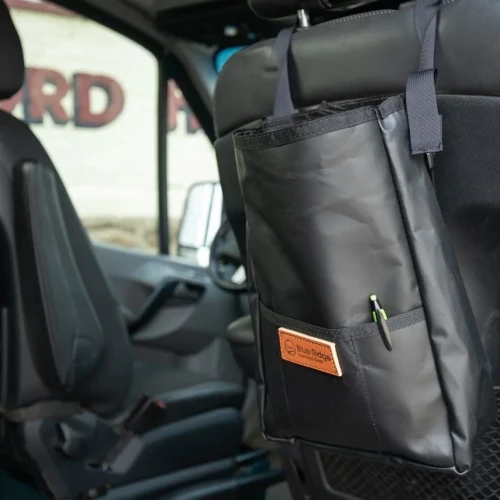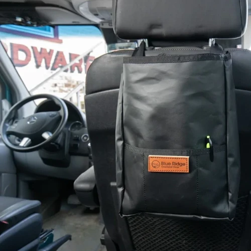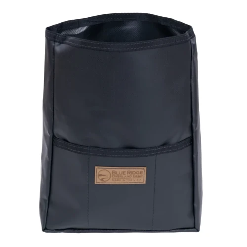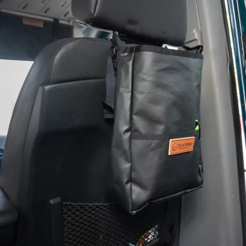Blue Ridge Overland Gear Headrest Trash Bag er en søppelpose man henger på seteryggen - som oftest bak på passasjersetet, da kan den brukes når du kjører bil alene. Enkel å ta av for å tømme da den henger fast med en plastspenne. Posen er ikke 100% vanntett, men holder på fukt og små mengder vann. På utsiden av bagen er det tre små lommer for utstyr eller sjokoladen du snart skal spise og deretter kaste papiret.
