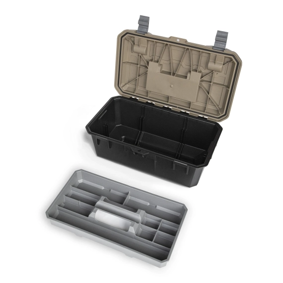 DECKED Crossbox verktøykasse er en verktøykasse som er ca halvparten av størrelsen til storebroren. Passer i begge skuffstørrelsene i hver sin retning. Laget i robust plastmateriale.