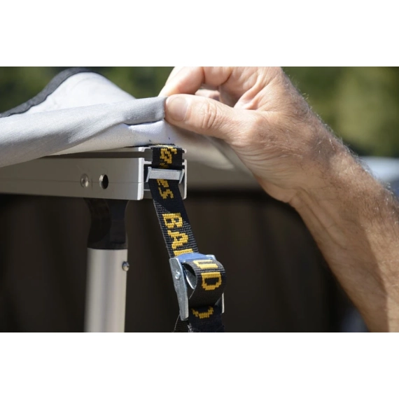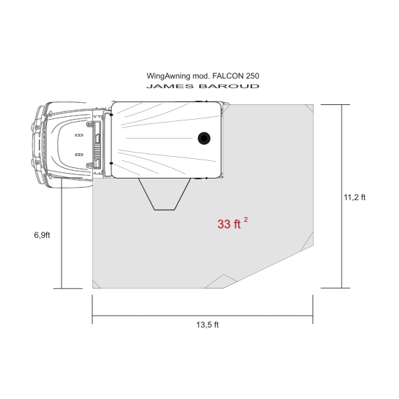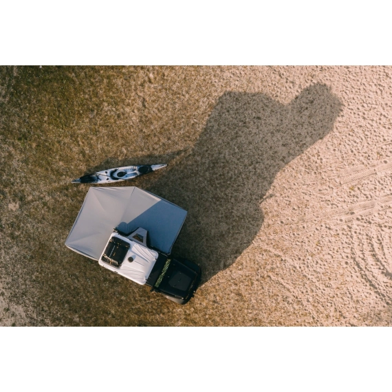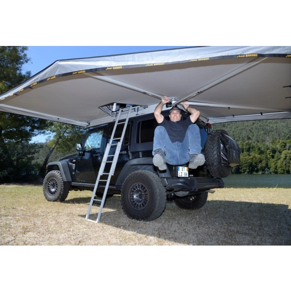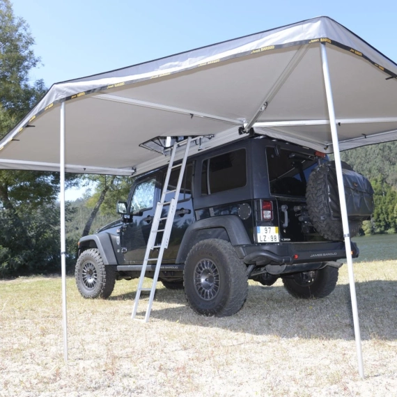 En 270 graders markise fra James Baroud. Dette er en imponerende, selvbærende markise med en "tunnelåpning" til James Baroud takteltet. En tunnel gjør at du kan lukke inngangen til teltet helt (tilleggsutstyr) Da slipper du å bli våt når du skal inn og ut av teltet på regnfulle dager.