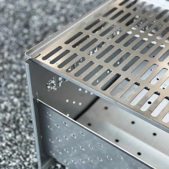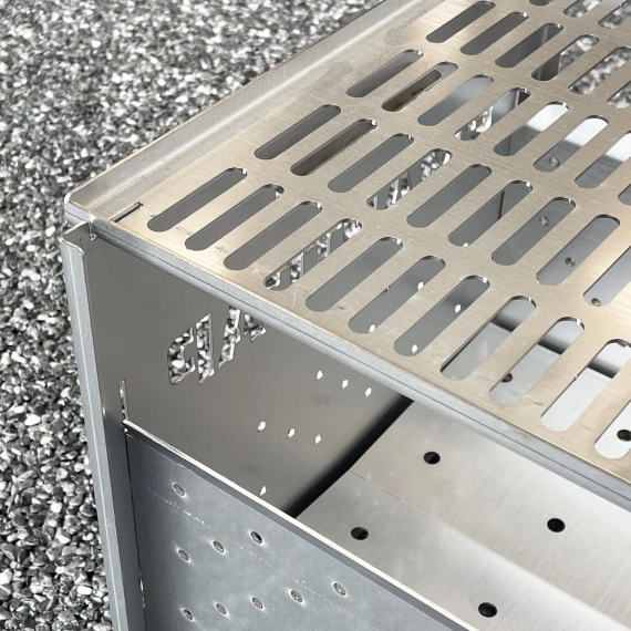 Liten og lett sammenleggbar grill eller bålkasse laget i 2mm stålplate. Flatpakkes enkelt sammen i medfølgende nylonbag.